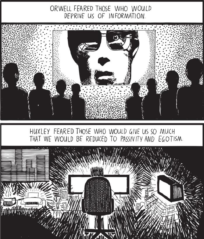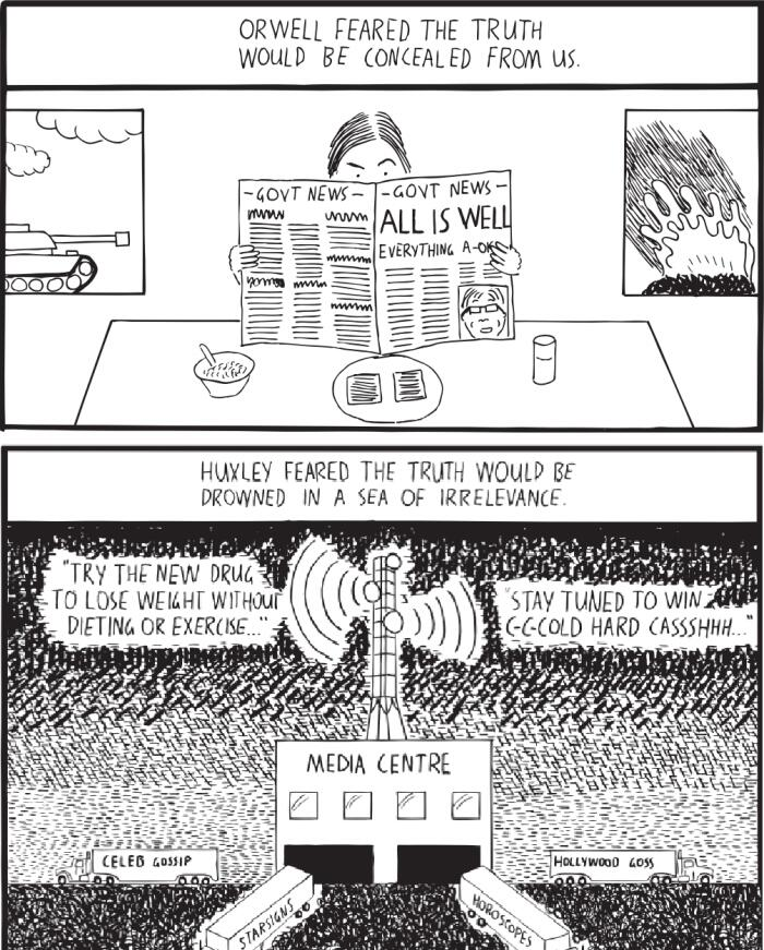 「オーウェルが恐れたのは、本を禁止する者たちでした。ハクスリーが恐れたのは、本を禁止する理由がなくなることでした。なぜなら、本を読みたいと思う者がいなくなるからです。オーウェルは、私たちから情報を奪う者たちを恐れました。ハクスリーは、私たちにあまりにも多くの情報を与え、私たちを受動的で利己的な存在に陥らせる者たちを恐れました。オーウェルが恐れたのは、真実が私たちから隠蔽されることでした。ハクスリーが恐れたのは、真実が意味のない情報の海に溺れてしまうことでした。オーウェルが恐れたのは、私たちが囚われた文化になることでした。ハクスリーが恐れたのは、私たちが、フィーリーズ、オージーポージー、遠心力バンブルパピーのようなものに夢中になる、つまらない文化になることでした。」 – ニール・ポストマン – 死に至る娯楽