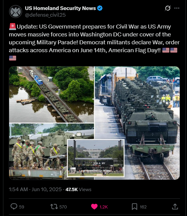 誤解しないでください。これは通常の状況ではありません。米陸軍はワシントンD.C.で見せかけの訓練を行っているわけではありません。4,000人の州兵がロサンゼルスに派遣されました。今、D.C.は第二ラウンドに備えています。過激派が組織化しています。連邦軍が動員されています。アメリカ国民は夢遊病状態です。