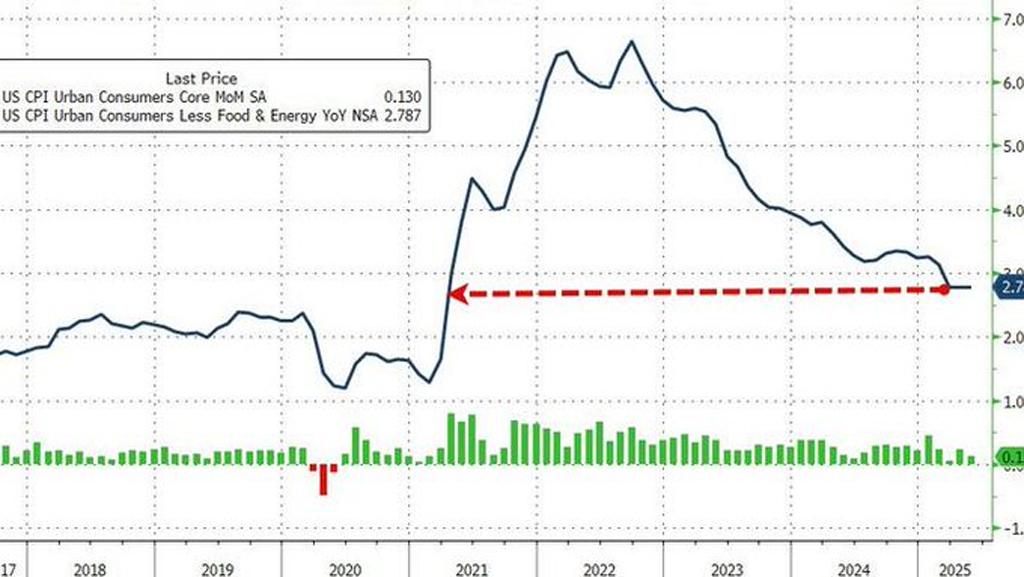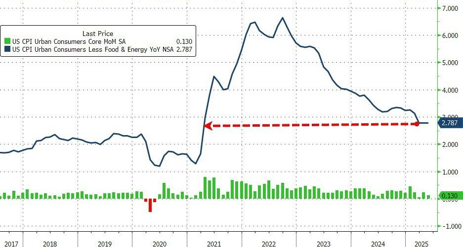 コアCPIは、平均的な博士号を持つ専門家たちにとってさらに失望的な結果となりました。前月比で0.1%上昇(予想の+0.3%を大幅に下回る)し、前年同月比では4月の+2.8%と横ばいとなり、2021年3月以来の最低水準となりました…