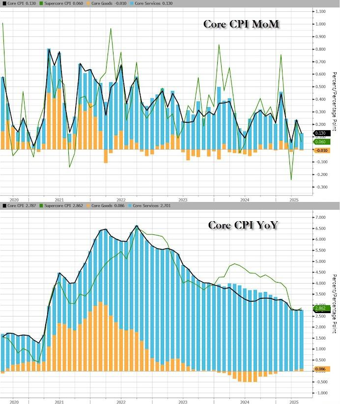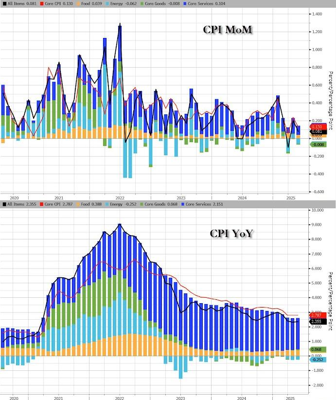 関税恐怖の平均的なアメリカ人への影響の最初の真の実験とされる今日のCPIは、調査の結果、糞便が回転物体に衝突しようとしていることを示唆する結果が続いたことから、小幅の上昇が見込まれていました… まさに、主流メディアのエコノミストたちが警告していたとおりです。