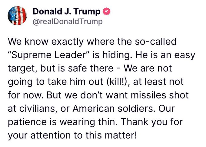 これは慈悲ではありません。これは外科的残酷さで実行された心理戦です。トランプは弱さを示しているのではありません。彼は支配力を示しています。「最高指導者」は、自分が生きているのはトランプがそう言っているからだけであることを知っています。彼は自分の位置が漏れていることを知っています。彼は、十分な深さの地下壕がないことを知っています。そしてテヘランにとって最悪なのは、イランの指揮系統全体がそれを知っていることです。