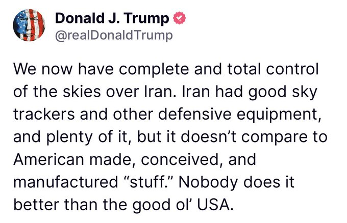「無条件降伏! 私たちは現在、イラン上空を完全に支配しています。」