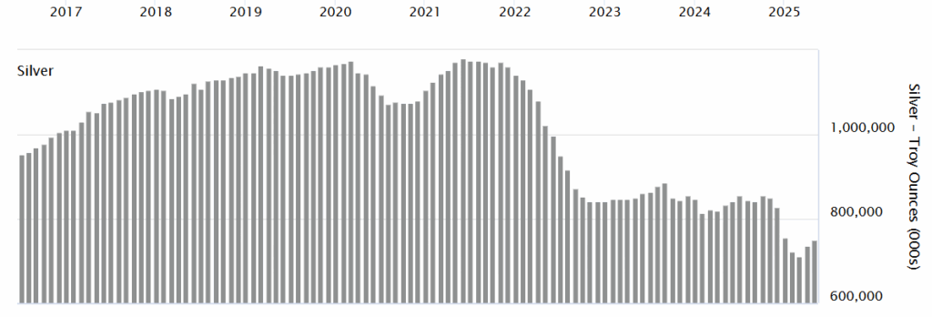銀を必要とする産業企業が、通常の供給業者から銀を調達できず、代わりに銀行に納入を依頼した場合、どうなるでしょうか? ここで問題が発生します。銀行は、契約額に比べ、物理的な準備高がごくわずかだからです。銀は、産業需要(太陽電池パネル、AIチップなど)による供給が年間6億8,000万オンス増加するにもかかわらず、2025年には5年連続の供給不足(1億1,760万オンス)に直面する見通しです。納品をトリガーする先物契約のほとんどがCOMEXで取引されているため、最近COMEXの銀倉庫の在庫が急増していることは驚くべきことではありません。