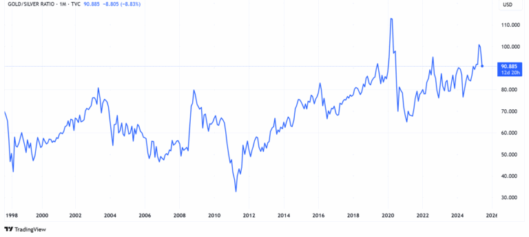 銀行が長年にわたり産業規模で空売りを繰り返してきた結果、金と銀の価格格差は、こちらでご覧いただけるように、不条理なレベルにまで達しています。