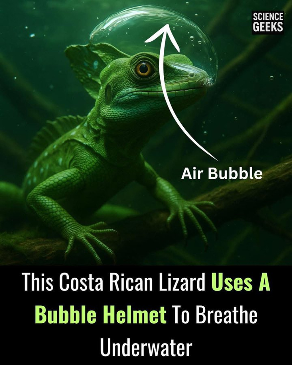 このコスタリカのトカゲは、水中で呼吸するために泡のヘルメットを被っています — これはSFではなく、科学です!🦎🌊
