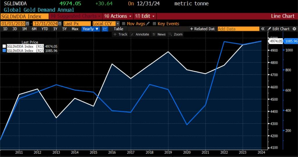 世界の金需要(白)および世界の中央銀行による純金購入量(青)、2010年~現在