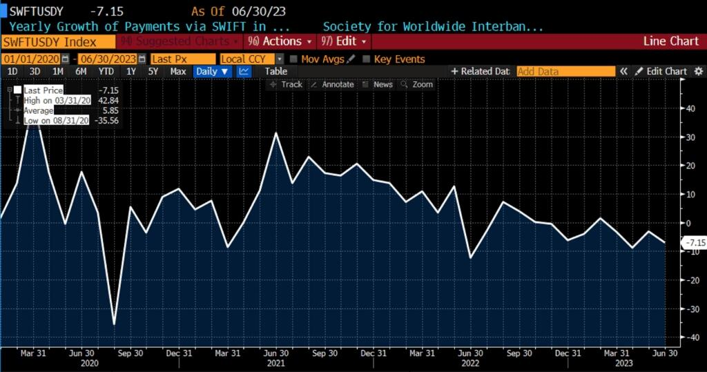 SWIFT経由の支払いの年間成長率(米ドル)、2020年~現在