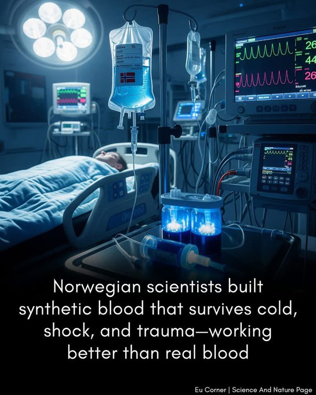 ノルウェーの高セキュリティな生物医学研究所で、研究者たちは、極端な外傷、極度の低体温、または長期保存の場合でも、人間の赤血球よりも効率的に酸素を運搬できる合成血液代替物を開発しました。この新しい「血液」は、凝固したり、有効期限が切れたり、血液型の適合を必要としません。