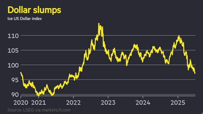 ドル指数(ドルの対主要6通貨(ポンド、ユーロ、円など)の相対的な価値を示す指標)は、2025年上半期に10.8%急落し、金本位制を基盤としたブレトン・ウッズ体制終了後、年初からの最悪のスタートを切りました。