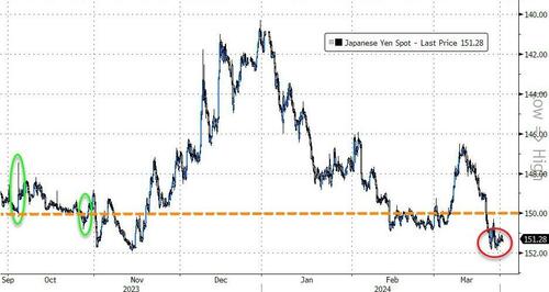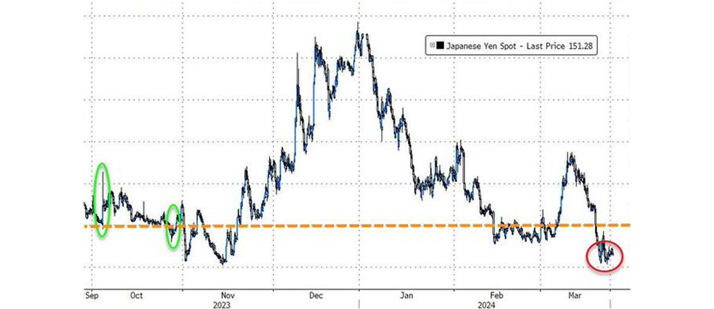 USDJPYは、2022年9月から10月にかけて、円をサポートするために重要な介入が行われたレベル(下の緑の楕円)を試している…