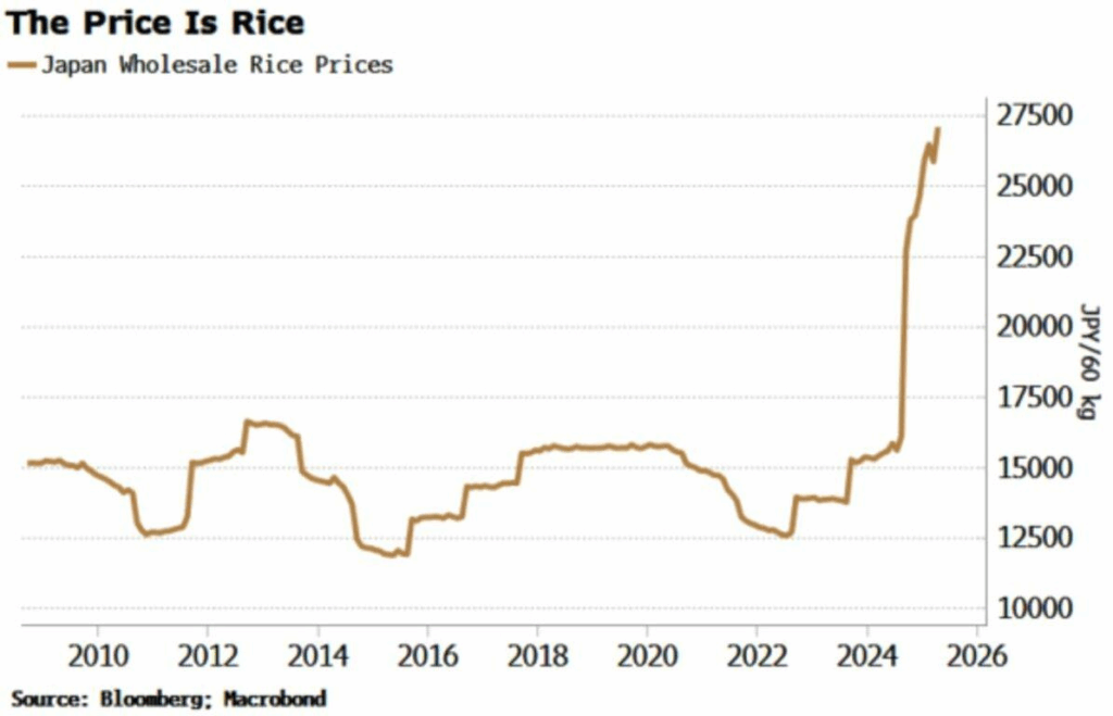 1か月余り前、私たちは(そしてエコノミスト誌は約1か月後に)、日本の急騰するインフレと経済縮小の苦境を1つの単語で要約しました。それは「米」です。まあ、厳密に言えば、もう少し長い単語でしたが。私たちが述べた内容は次のとおりです。