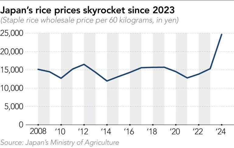 6月時点で、5キログラム入りの米1袋の平均価格は4223円(29.15ドル)で、1年前のほぼ2倍となっています。学校によっては、給食に米を提供する日を減らしているところもあります。また、小売店やレストランでは米料理の価格を値上げしています。