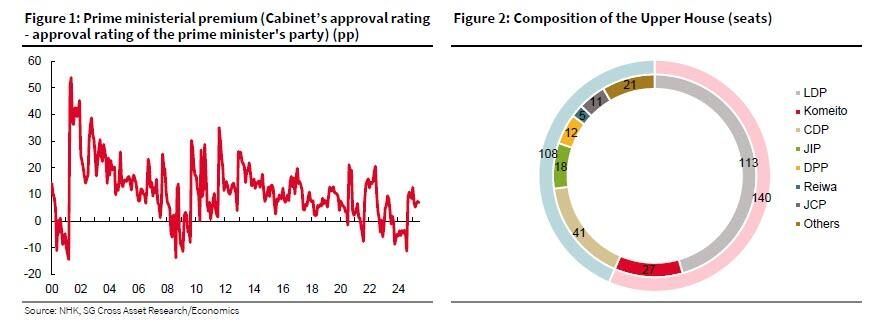 ソシエテ・ジェンの神崎仁氏が本日公開したレポート(プロ購読者限定)の中で、同ストラテジストは参議院選挙が7月20日に予定されていることに触れ、6月22日の東京都議会議員選挙を受けて自民党はもはや第一党ではないと記しています。しかしながら、6月上旬の内閣支持率と与党支持率(自民党と公明党)はともに、それぞれ5月から6.0%と4.7%上昇しました。この上昇は、小泉農林水産大臣による米価引き下げ努力、具体的には緊急備蓄米の低価格での投げ売り(その過程で長期的にははるかに高い価格を保証する)に対する一定の評価によるものと考えられます。しかしながら、6月末に実施された調査では、内閣支持率と与党支持率は6月上旬からそれぞれ5.0%と4.0%再び低下していることが示されました。