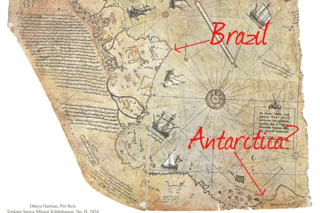1513年にトルコの提督であり地図製作者のピリ・レイスによって作成された地図ですが、そのソースはさまざまな古い地図であり、南極大陸が氷に覆われる前の、非常に遠い昔の様子を描いたものとの説もあります。