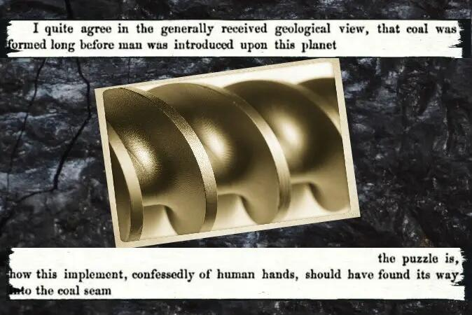 ジョン・ブキャナン氏は、1852年12月13日にスコットランド古物研究協会(Society of Antiquaries of Scotland)の会議で、謎めいた物体を披露しました。その物体は、厚さ約22インチの石炭に包まれたドリル・ビットで、厚さ約7フィートの粘土と岩の混合層に埋もれていました。