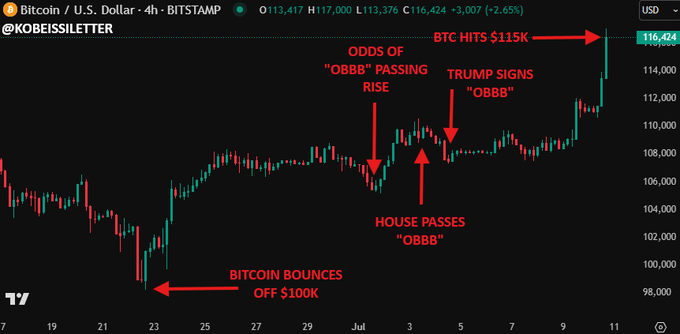 市場がトランプ大統領の「Big Beautiful Bill」の可決を価格に反映し始めたところ、Bitcoinは急騰しました。