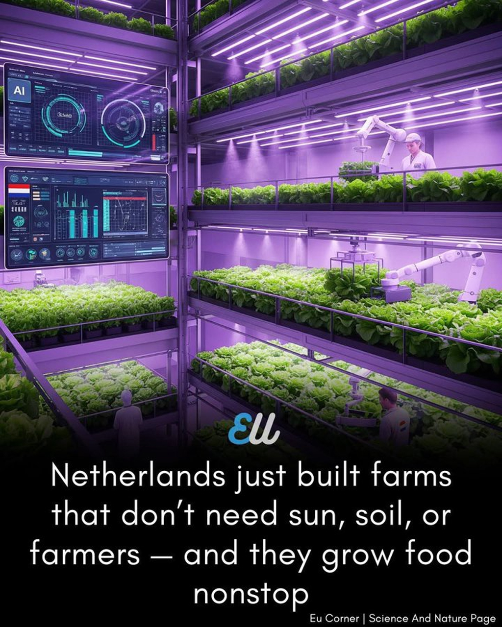 ロッテルダム郊外の無記名の倉庫内で、紫とピンクの不思議な光が輝いています(しかし、内部には太陽はありません)。これがオランダの新たなAI搭載垂直農場のひとつで、土や天候を一切使用せず、ほぼ人間の手に触れることなく、完全自動化で食品が栽培されています。