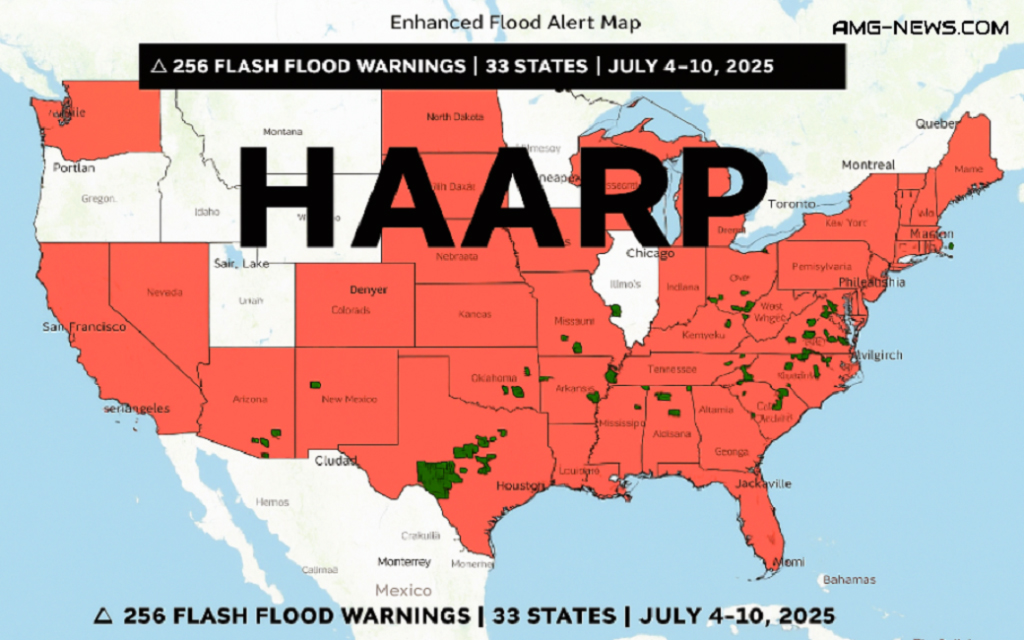 2025年7月4日、国の独立と自由の象徴的な日以来、米国は、従来の気象学では説明できないほどの洪水による混乱に陥っています。わずか6日間で256件以上の公式の洪水警報が発令され、南部、中西部、東海岸の33州が影響を受けています。これはハリケーンでも、熱帯性暴風雨でもありません。これは全国規模の大気封鎖でした(精密に計画され、外科的に分散され、機械的な正確さで実行されたものです)。