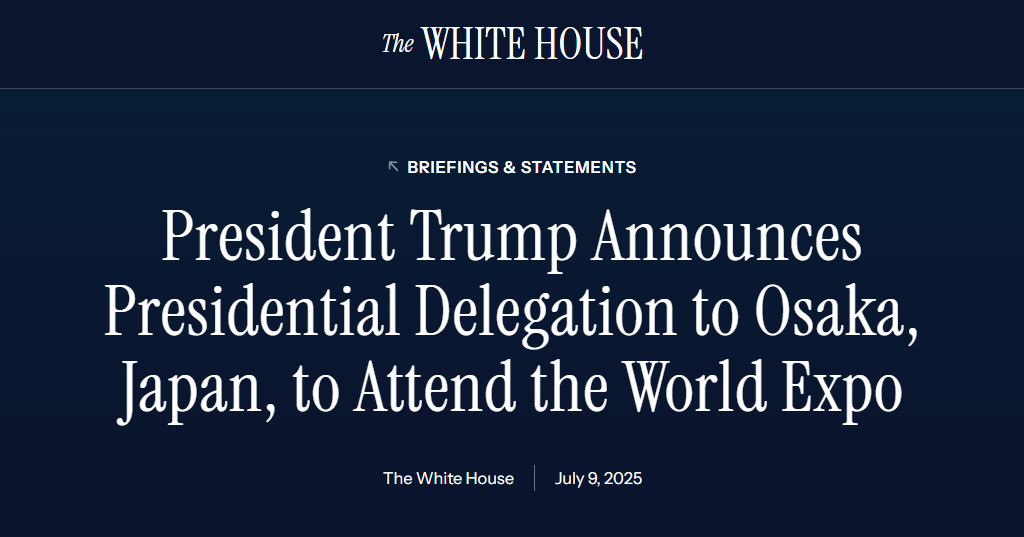 ドナルド・J・トランプ大統領は本日、2025年7月19日に開催される世界博覧会に出席するため、大阪に大統領特使団を派遣することを発表しました。