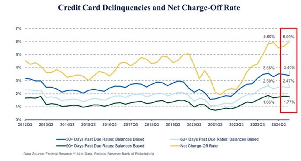 大手銀行の30日以上延滞のクレジット・カード残高の割合は、2025年第1四半期に3.40%に達し、少なくとも13年間で3番目に高い水準となりました。