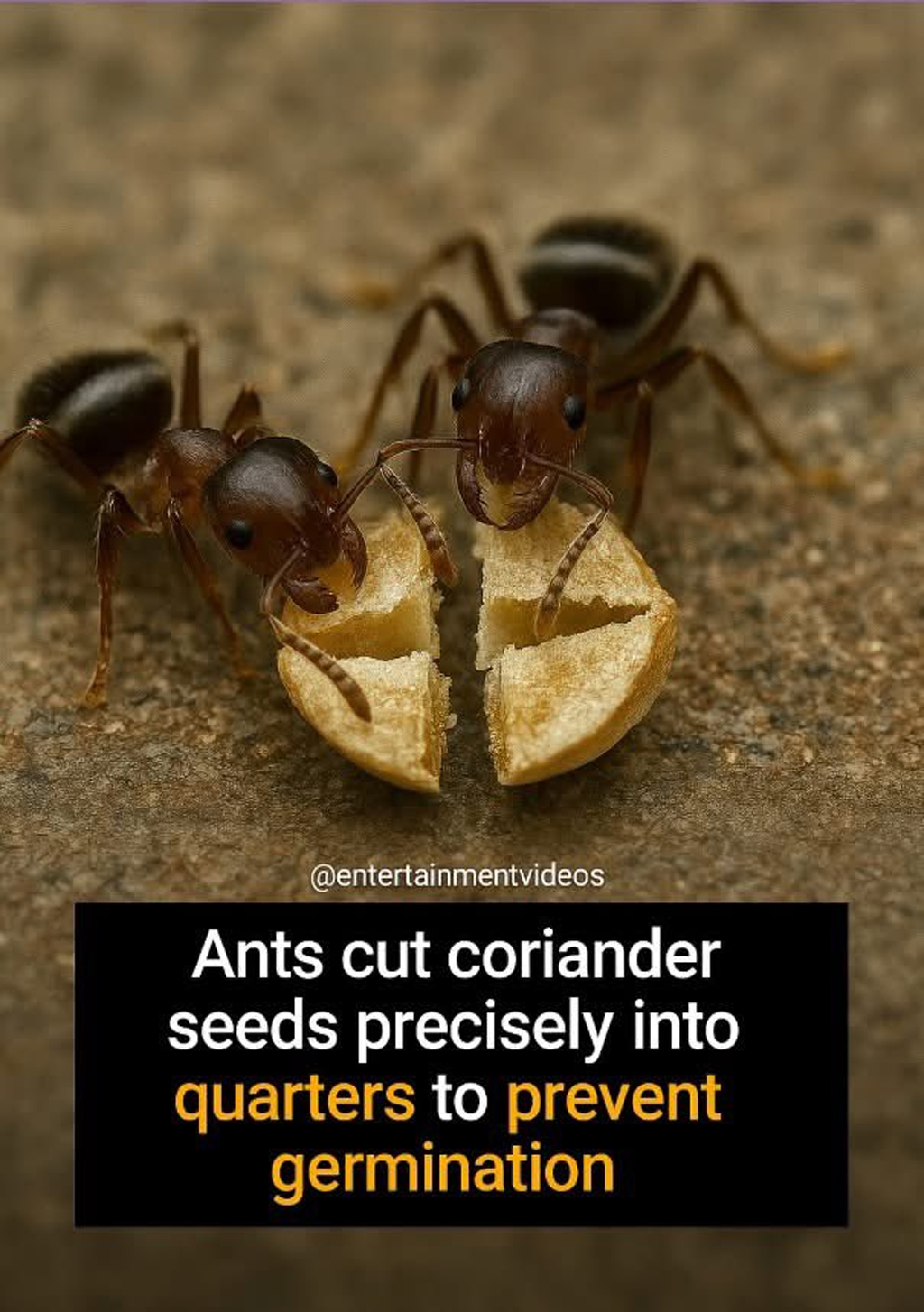 🔍 科学者たちは先日、アリはコリアンダーの種を半分に切るだけでなく、4つに切っていることを発見しました。