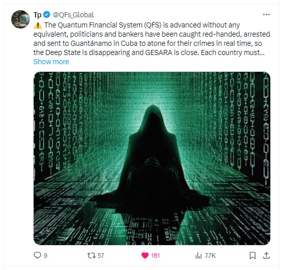 「この新しいQFSは、軌道上の人工衛星に搭載された量子コンピューターで動作し、ハッキングされないように秘密の宇宙プログラムによって保護されています。この量子テクノロジーは、慈悲深い銀河のETから提供されたものです。新しい金融システムの目的は、銀行界における陰謀団の腐敗、利殖、操作に終止符を打つことです。重要なのは、腐敗した銀行家が大きな利益を得ることを防ぐ制限を導入することです」