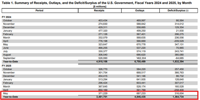 7月に入り、市場は2025年5月単月の米国財政赤字が3,160億ドルに達したというデータを受け取りました。