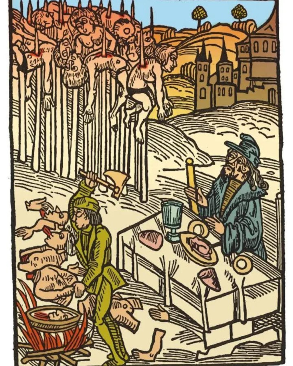 1499年のドイツの印刷物には、ドラキュラが襲撃で捕らえたザクセン商人の死体と瀕死の死体のそばで食事をする場面が記録されています。
