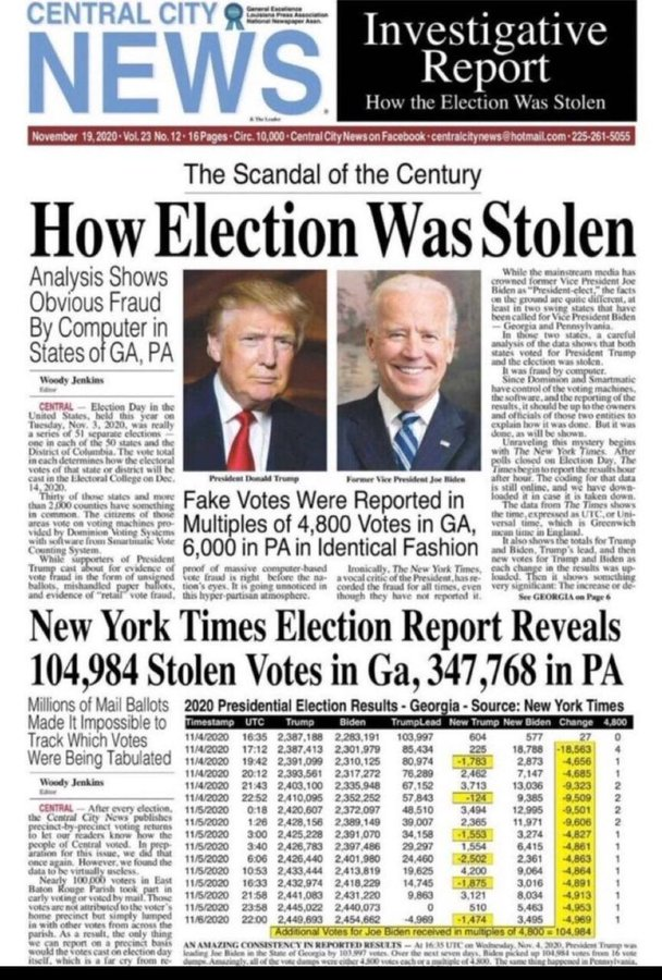 ニューヨーク・タイムズ紙が、おそらく最も決定的な証拠となる情報を報じました。同紙の選挙報道では、ジョージア州で104,984票、ペンシルベニア州で347,768票の投票が盗まれたという衝撃的な数字が明らかになりました。ちょっと考えてみてください。この票だけで選挙の結果は逆転する可能性があります。しかも、これは2州だけの数字です。ミシガン州、ウィスコンシン州、アリゾナ州、その他の激戦州についてはまだ詳しく調べていません。