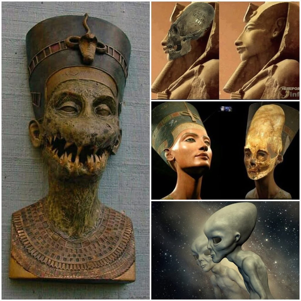 左側では、腐敗した胸像が古典的な優雅さと怪物的な恐怖を融合させています。これは、時間が記憶を歪めることを象徴的に反映しているかもしれません。右側では、細長い頭蓋骨、スタイリッシュな再構築、異星人のような形態が、古代エジプトと異世界的な存在を結びつける理論を暗示しています。主流の考古学は、細長い頭蓋骨を儀式的な頭蓋骨形成に帰属させていますが、このような画像は、科学を超えた推測的な物語へと疑問を投げかけます。