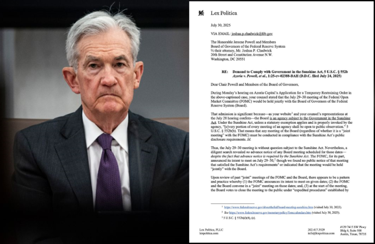 今、Azoria Capitalは、政府機関の会合を一般に公開することで民主主義を守ることを目的とした法律である「政府情報公開法」に基づき、パウエルとFRBを提訴し、法的核兵器を爆発させました。彼らの要求はシンプルですが、衝撃的なものです。