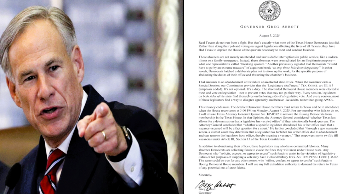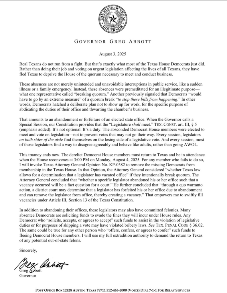 アボットはテキサス州司法長官の意見KP-0382を引用し、法律を武器として用いています。選出された職務の放棄は、職の喪失であり、それは明白でシンプルな事実です。言い訳も、「政治劇場」という表向きの物語も一切ありません。国民は、立法者を、立ち上がって戦うために選出したのであり、実際の戦いが始まったときにネズミのように逃げ回るために選出したのではありません。