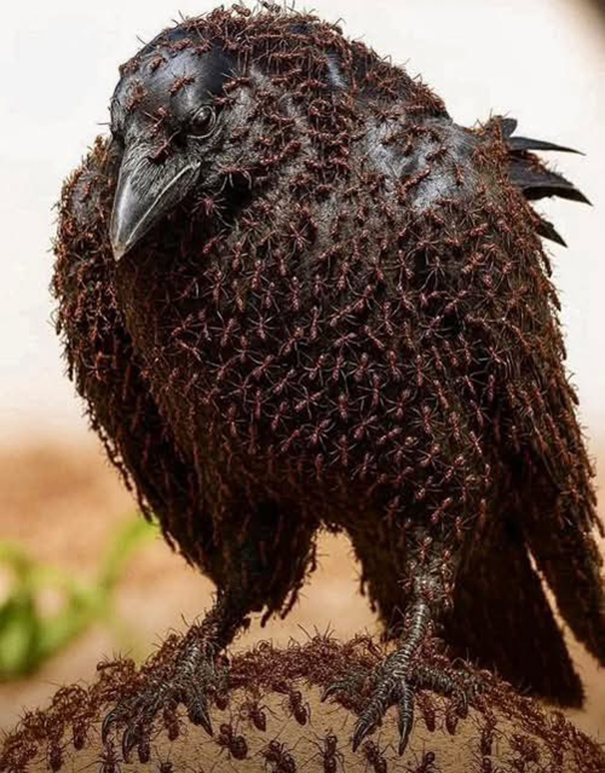 この不思議な儀式には重要な機能があります。アリは、抗菌作用と寄生虫駆除効果を持つ天然物質である蟻酸を放出します。アリに「侵攻」されることで、カラスは皮膚や羽毛に主に影響を与える真菌、細菌、寄生虫と戦うための自然療法のような効果を得ます。