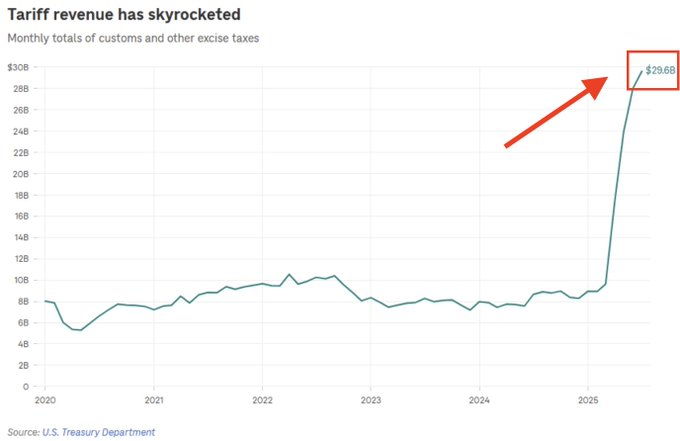 2025年7月の米国関税収入は+300%急増し、1ヶ月間で記録的な296億ドルを調達しました。
