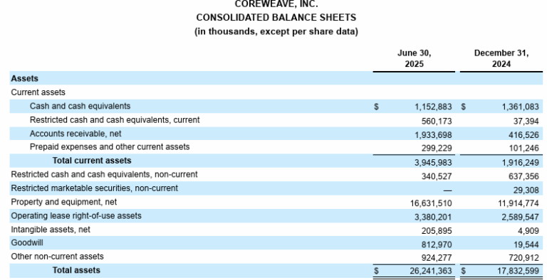 CoreWeaveはこの相違をどのように説明しているのでしょうか? 同社は、バランス・シートに「制限付き現金および現金同等物、非流動」という新しい項目を合計340,527,000ドルとして計上しています。ちょっと待ってください、現金が「非流動」資産になるなんてあり得るのでしょうか?これは、新しい会計のフロンティアであるに違いないと思います。