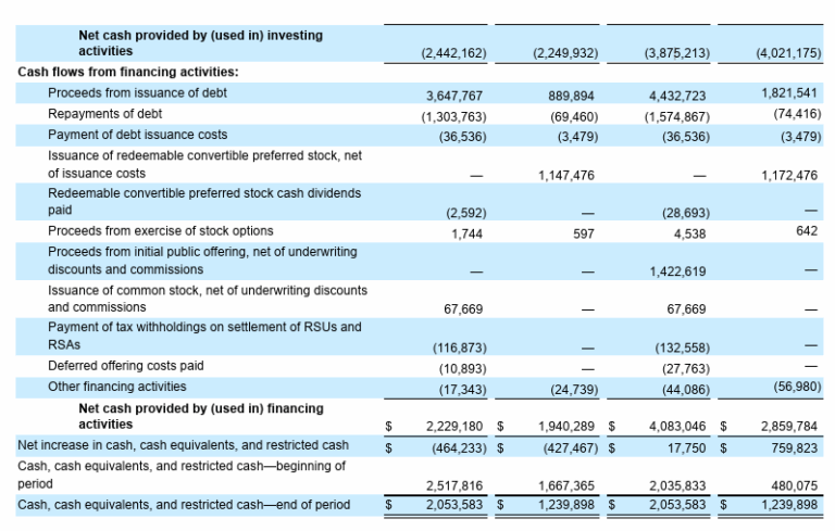 キャッシュの計算は、CoreWeaveが完全に計算を誤っている部分です。当四半期、同社は29億ドルの設備投資を行ったと主張している一方で、2030年満期の9.25%の無担保優先社債を発行して20億ドルの現金を調達しています。キャッシュ・フロー計算書によると、CoreWeaveの営業活動は当四半期に約2億5000万ドルの損失を出しています。2025年3月31日現在、CoreWeaveは「現金および現金同等物」として1,276,456,000ドル、「制限付き現金」として624,250,000ドルを報告し、合計1,900,706,000ドルの「現金」を保有しています。ただし、2025年6月30日現在、CoreWeaveは「現金及び現金同等物」として1,152,883,000ドル、「制限付き現金」として560,173,000ドルを報告し、合計1,713,006,000ドルの「現金」を保有しています。