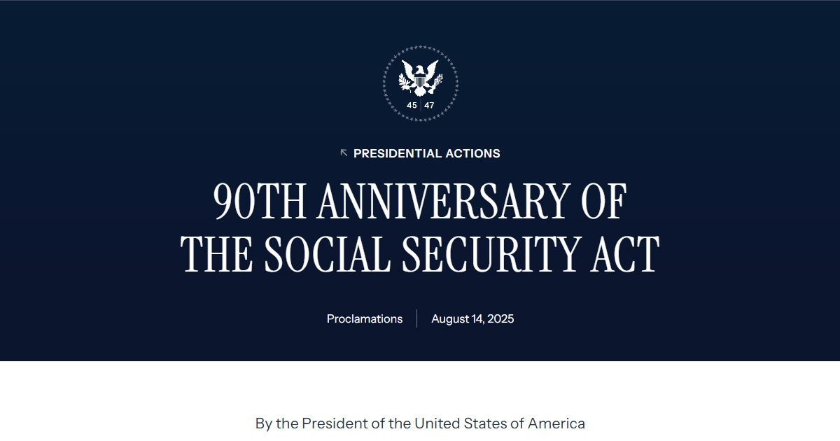 ソース:https://www.whitehouse.gov/presidential-actions/2025/08/90th-anniversary-of-the-social-security-act/