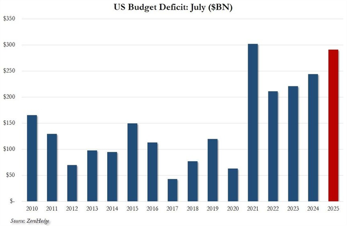 米国財務省は7月の財政赤字が2,910億ドルに達し、7月としては過去2番目の規模となったと発表しました。