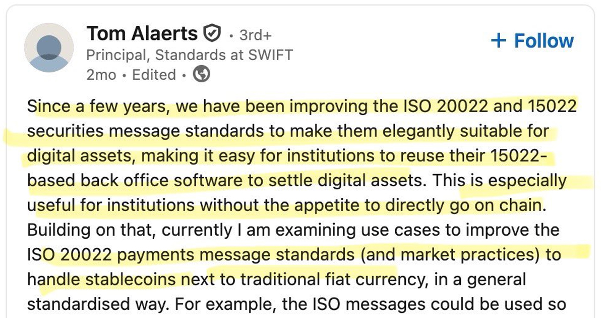「数年間にわたり、私たちはISO 20022および15022の証券メッセージ規格を改善し、デジタル資産に適切かつ効率的に対応できるようにしてきました。これにより、機関は15022ベースのバック・オフィス・ソフトウェアを再利用してデジタル資産の決済を行うことが容易になります。これは、チェーン上に直接移行する意欲のない機関にとって特に有用です。」🔑