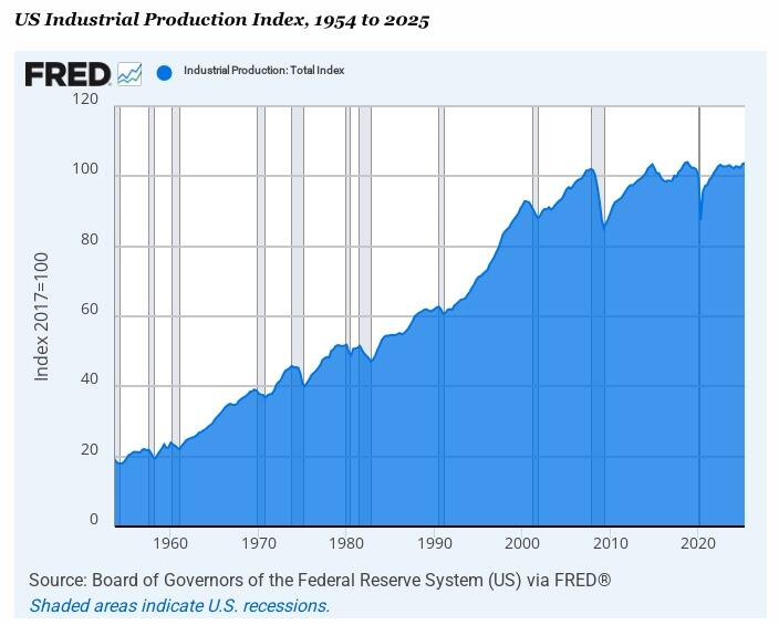 つまり、製造業、エネルギー、鉱業、公益事業の生産高の合計を測定する米国の工業生産指数は、1954年から2007年の間に3.3%の年間成長率で直線的に上昇しました。