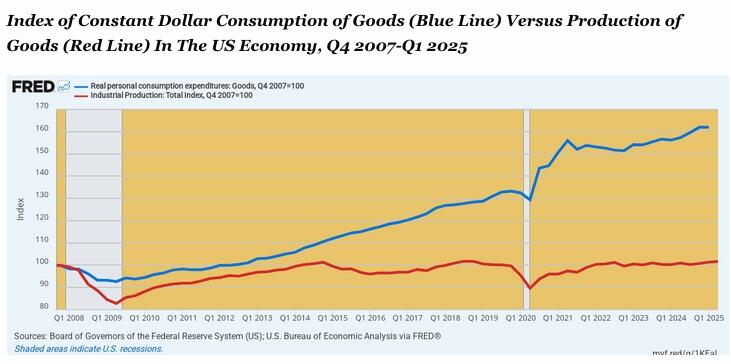 つまり、財(耐久消費財および非耐久消費財)の累積実質消費は62%増加しましたが、国内の工業生産は1.4%しか増加していません!