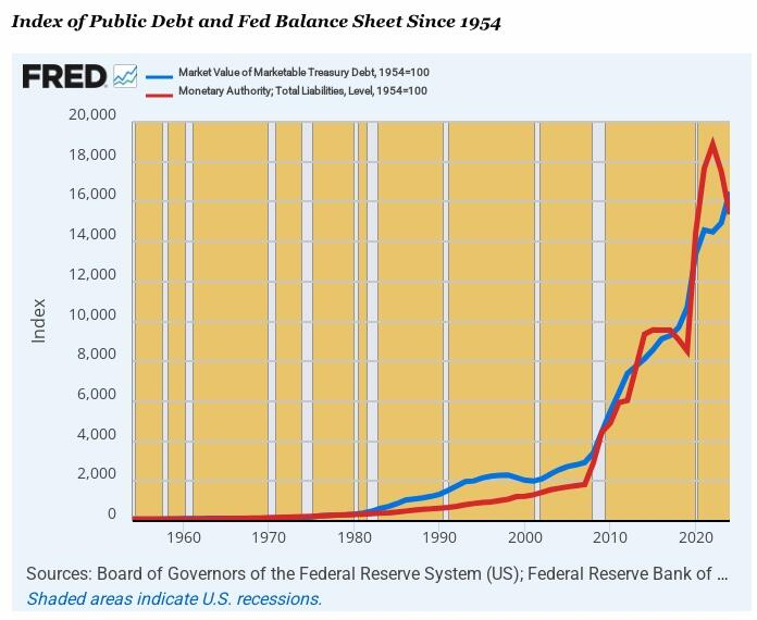 言うまでもなく、上記の乖離は、ワシントンを拠点とする政策当局者が努力を怠ったためではありません。1954年以降の連邦債務とFRBのバランス・シートの指数は、上記の産業指数チャートとは逆のパターンを示しています。つまり、1954年から2007年までは成長は鈍化から緩やかな伸びに留まっていましたが、その後急上昇しました。