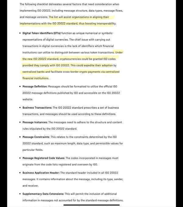 「新しいISO 20022規格に基づき、暗号資産はISO規格に準拠する場合、ISOコードが付与される可能性があります。これにより、中央銀行による暗号資産の採用が加速され、中央金融機関を通じた越境暗号資産決済が容易になる可能性があります。」✅