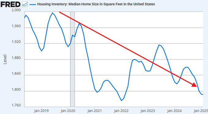 2025年1月時点で、米国の住宅の中央値は1,792平方フィートに減少しました。