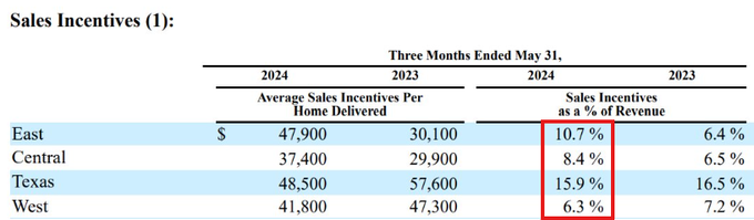 Lennar($LEN)の2024年の販売インセンティブは、米国の一部地域、特にテキサス州で売上高の15.9%に達しました。