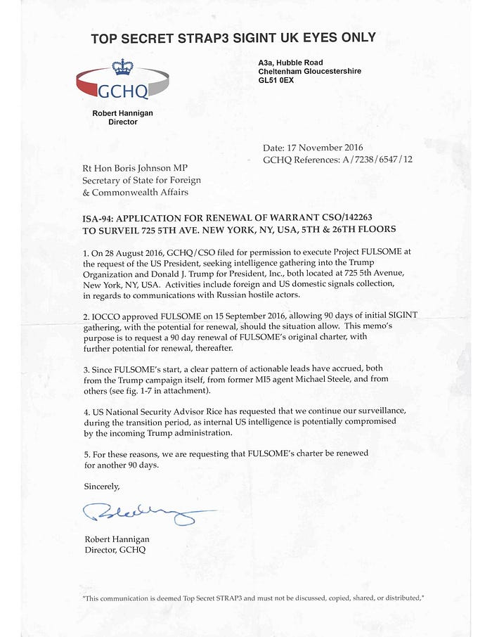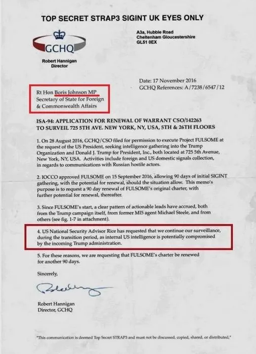 2016年11日付のこの書簡は、当時のGCHQ長官ロバート・ハニガンが英国外務大臣ボリス・ジョンソン宛てに、「米国大統領の要請により」トランプ氏のニューヨーク本社の「監視」許可を延長するよう要請したものだとされています。