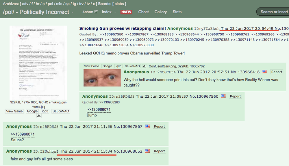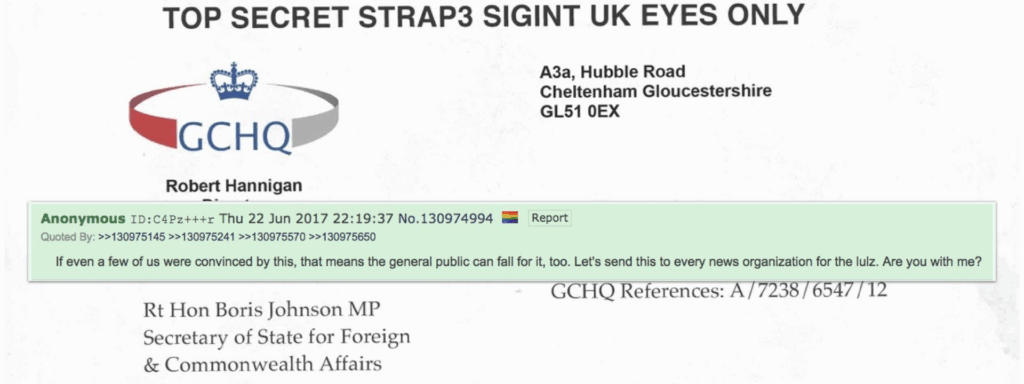 「面白半分で」偽の手紙を報道機関に送ろうという4chanのメッセージと、その偽の手紙のヘッダー(ソース:4plebs)。2017年6月22日、ID「yFIaEkoh」という匿名ユーザーが、極右や陰謀論者グループに人気のオンラインフォーラム「4chan」に偽の手紙を投稿しました。この手紙は、英国の電子情報機関GCHQが、バラク・オバマ大統領の指示により、2016年の米国大統領選挙で、当時の候補者であったドナルド・トランプの選挙陣営をスパイしていたことを示すものだと主張していました。