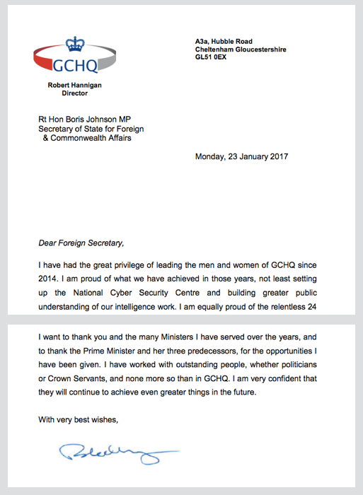 オンラインに投稿された画像から判断すると、この手紙はGCHQのレターヘッドで印刷され、ハニガンによって署名された後、2回折りたたまれてスキャンされたようです。