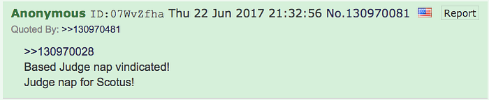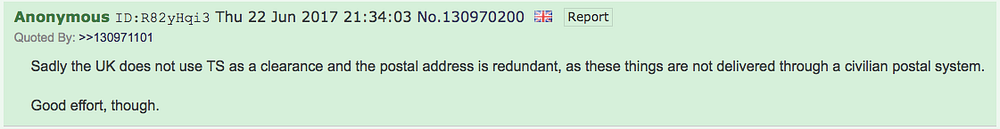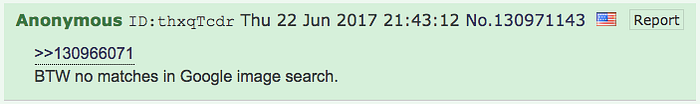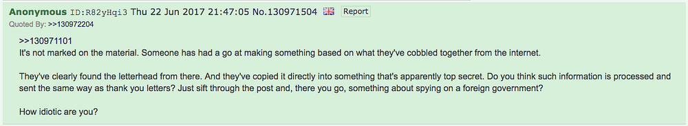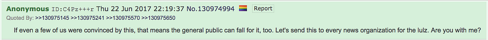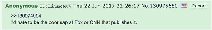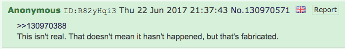 この偽造は投稿されるとすぐに発覚しました。4chanのページ・アーカイブによると、この投稿は2017年6月22日 20時54分49秒に投稿されました。19分も経たない21時13分34秒に、別の匿名ユーザーが「これは偽物だ」と返信しています。