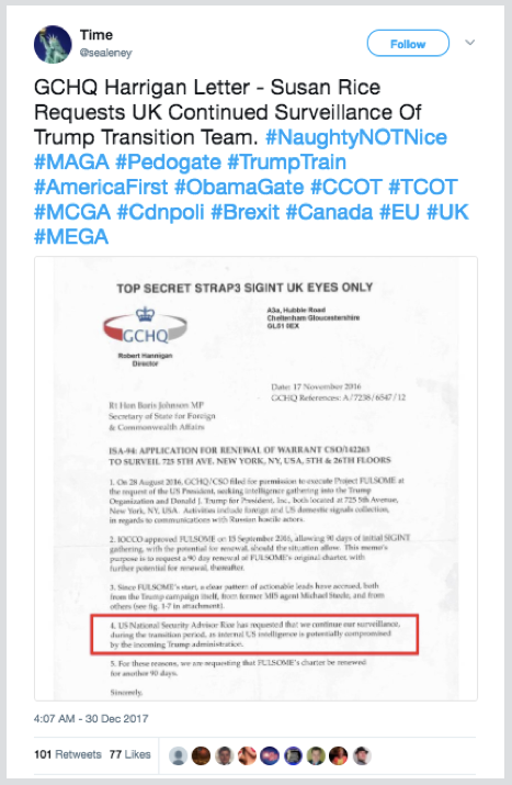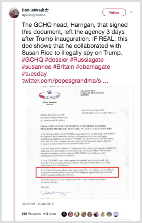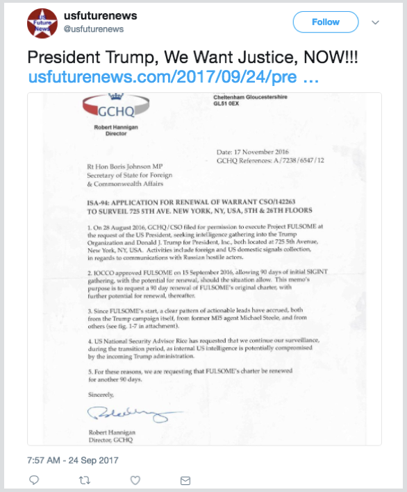 それにもかかわらず、この偽造文書は、極右のさまざまな場所や陰謀論サイトなどで繰り返し登場しました。2017年9月24日、USfuturenews.comというウェブサイトが、この文書を本物であるかのように掲載し、ツイートしました。この投稿はトランプ氏宛てで、「選挙戦中および選挙後にあなたに対して行われた違法な政治諜報活動の証拠は、反駁の余地のないものです」と主張していました。